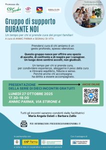 Gli incontri saranno condotti dalle facilitatrici Maria Angela Gelati e Barbara Zallio. L’iniziativa è all’interno del progetto “Alleanza per i caregiver”, promosso da CSV Emilia e Consorzio Solidarietà Sociale, con il sostegno di Fondazione Cariparma.