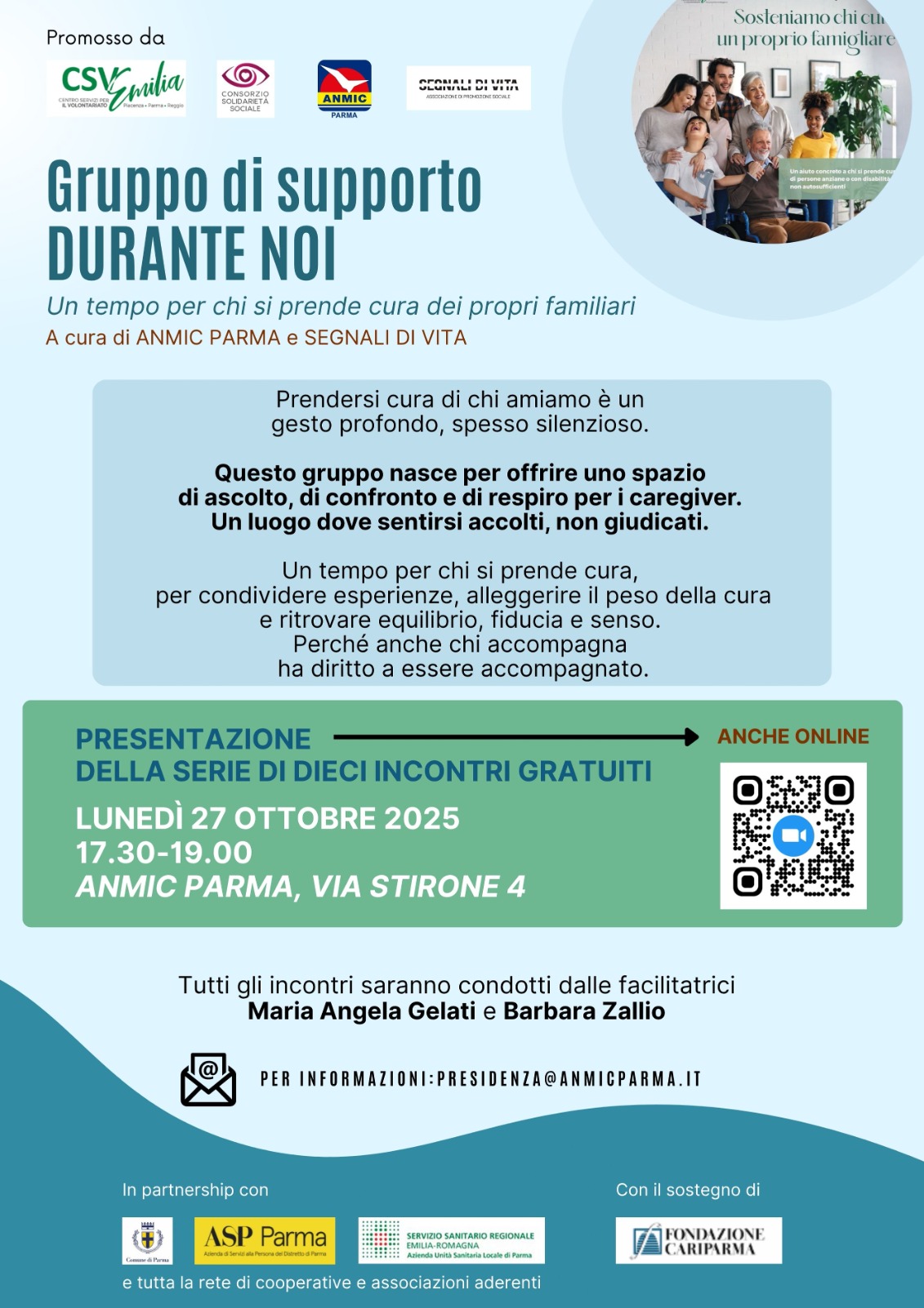 Prendersi cura di chi amiamo è un gesto profondo, ma spesso silenzioso. Riconoscendo l’impegno, la fatica e il bisogno di condivisione dei caregiver familiari, Anmic Parma, insieme all’associazione Segnali di Vita, annuncia la presentazione del Gruppo di Supporto “Durante Noi”. Questo spazio è pensato per offrire un luogo di ascolto, di confronto e di respiro per alleggerire il peso della cura e consentire ai partecipanti di sentirsi accolti, non giudicati.